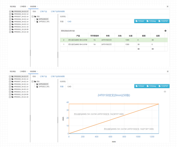 使用AI排产排版算法,通过选择订单产品,根据零部件大小、剪裁要求以及订单数量自动智能生成排版图纸。图纸在不借助AutoCAD等第三方软件的前提下,支持在线排版图纸预览、导出图片、导出CAD格式的dxf和dwg以及导出pdf。